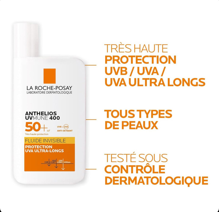 ضدآفتاب Anthelios UVMUNE 400 Invisible Fluid SPF50+ از برند معتبر La Roche-Posay، با فرمولاسیونی شفاف، سبک و بدون عطر، محافظت بسیار قویای را در برابر اشعههای UVA و UVB، بهویژه UVA بسیار بلند (Ultra Long UVA) ارائه میدهد. این محصول یکی از پیشرفتهترین ضدآفتابهای موجود است که بهخوبی از پوست در برابر آسیبهای ناشی از نور خورشید و پیری زودرس محافظت میکند.
