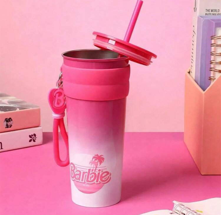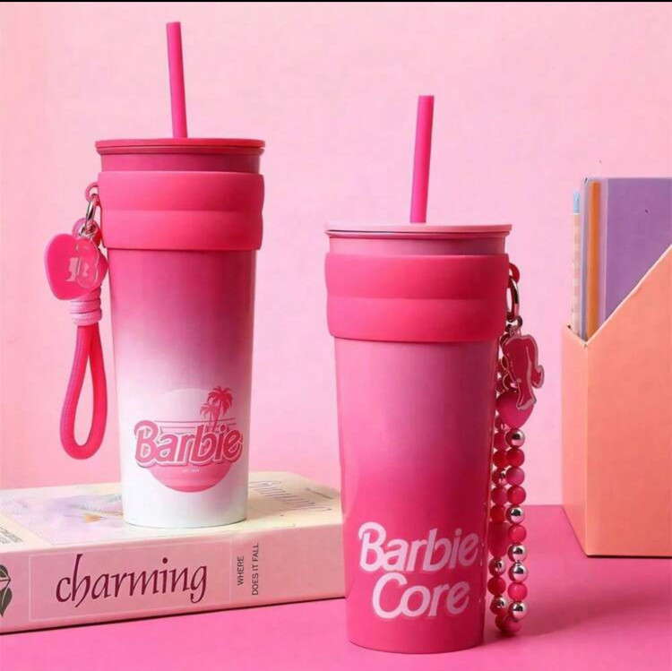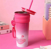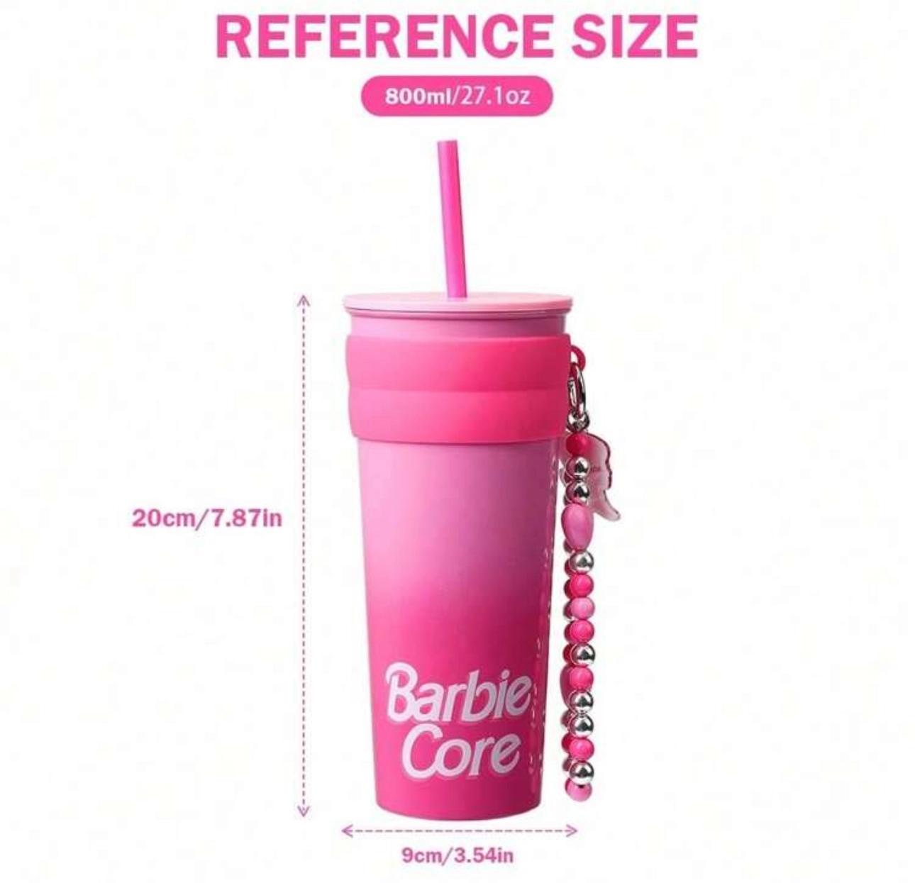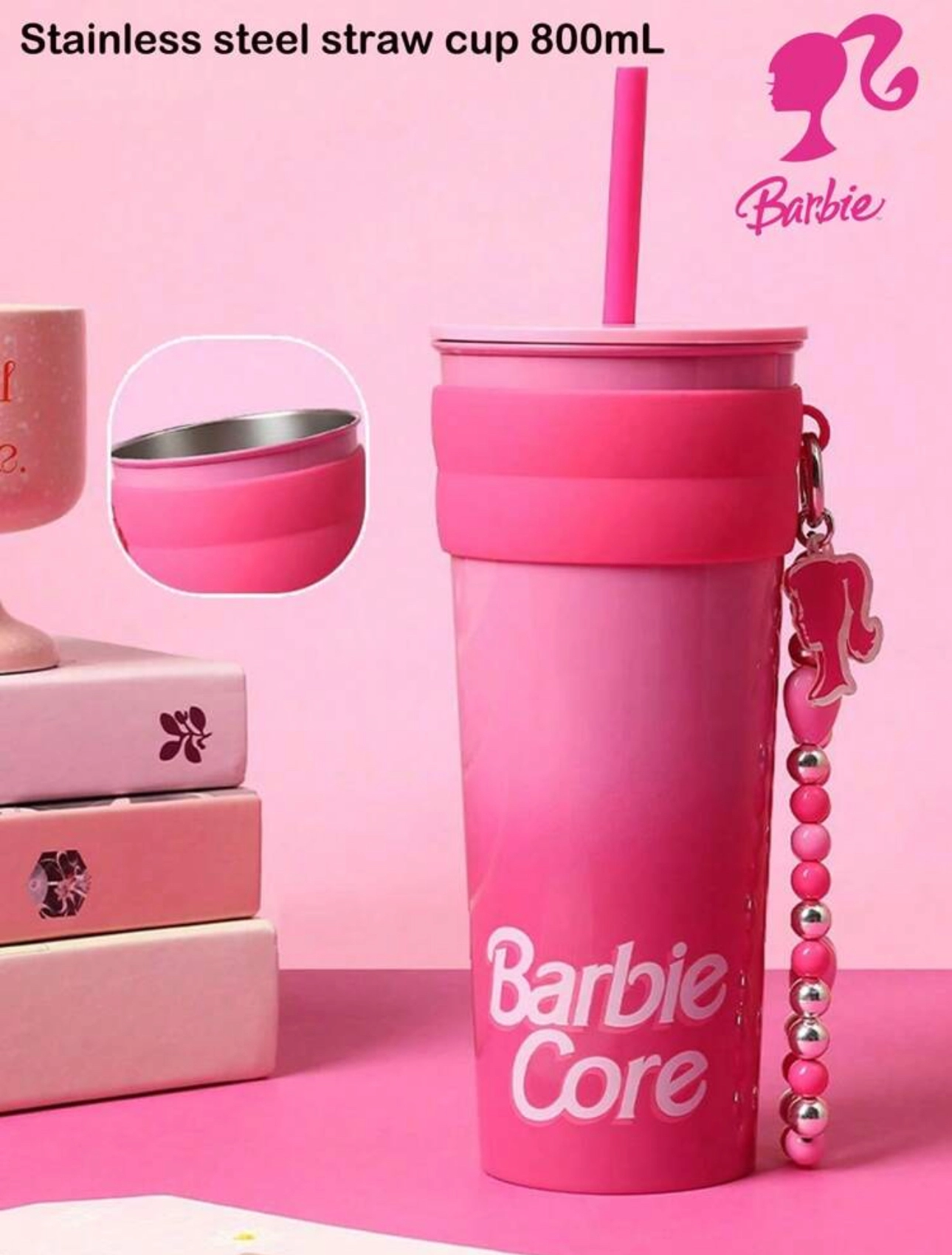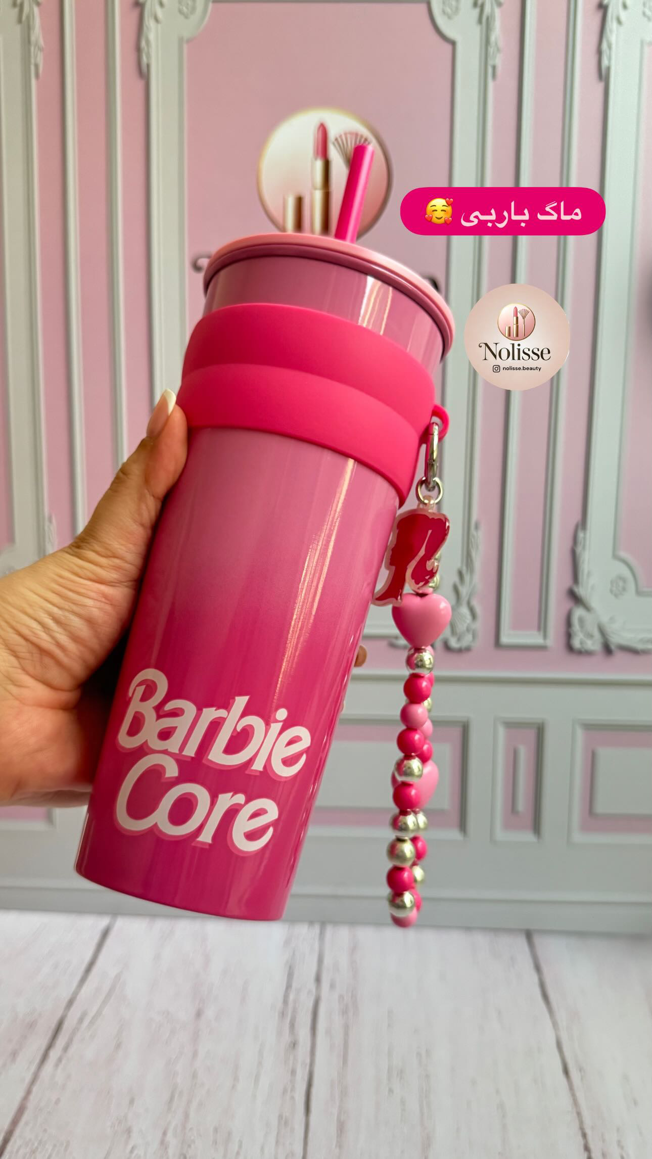 لیوان استیل باربی با نی و آویز فانتزی – ظرفیت ۸۰۰ میلیلیتر | مناسب برای هدیه، نوشیدنیهای سرد و روزمره