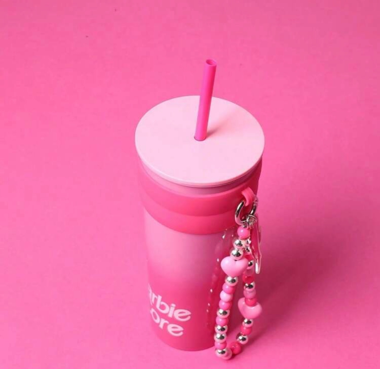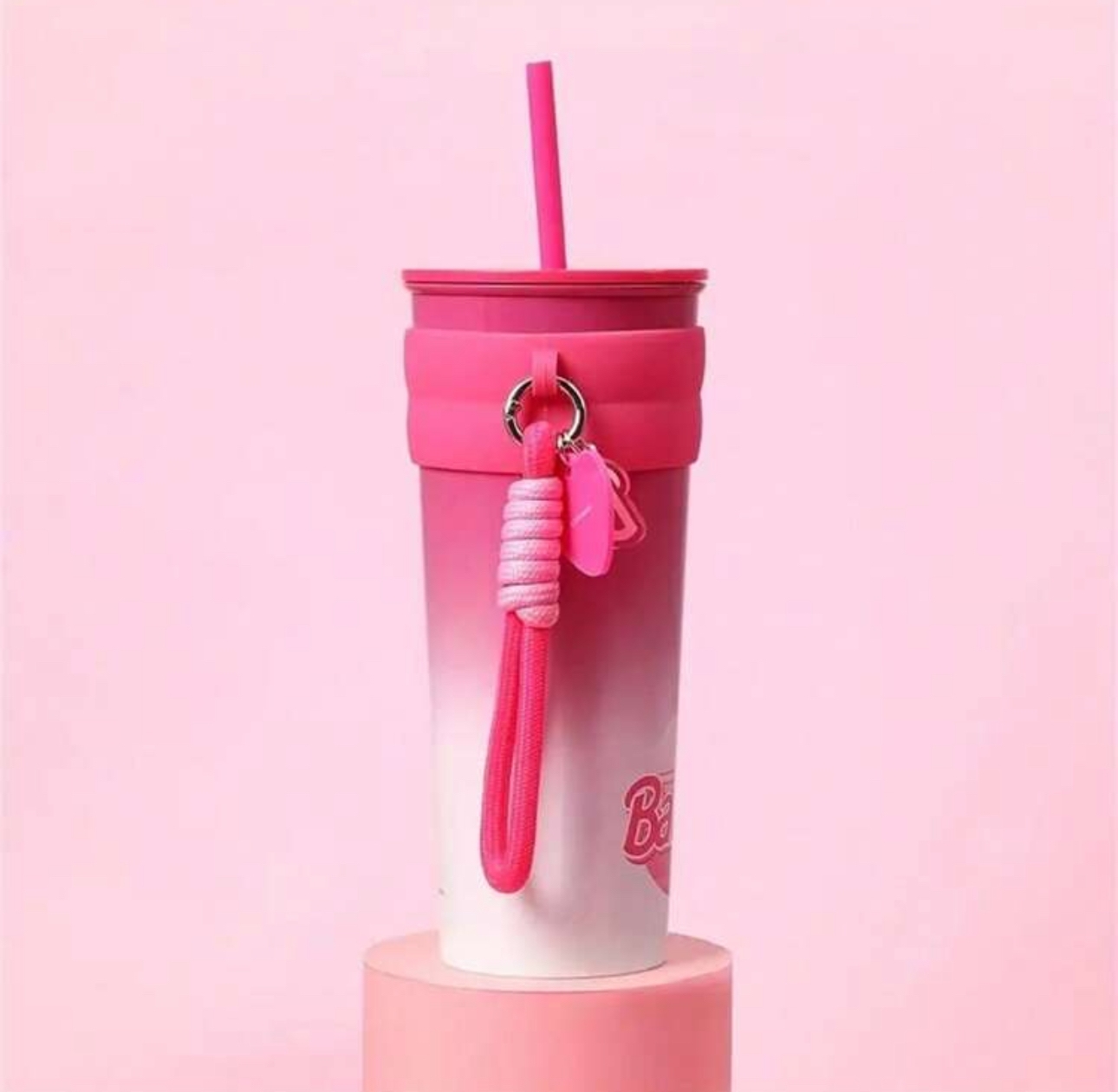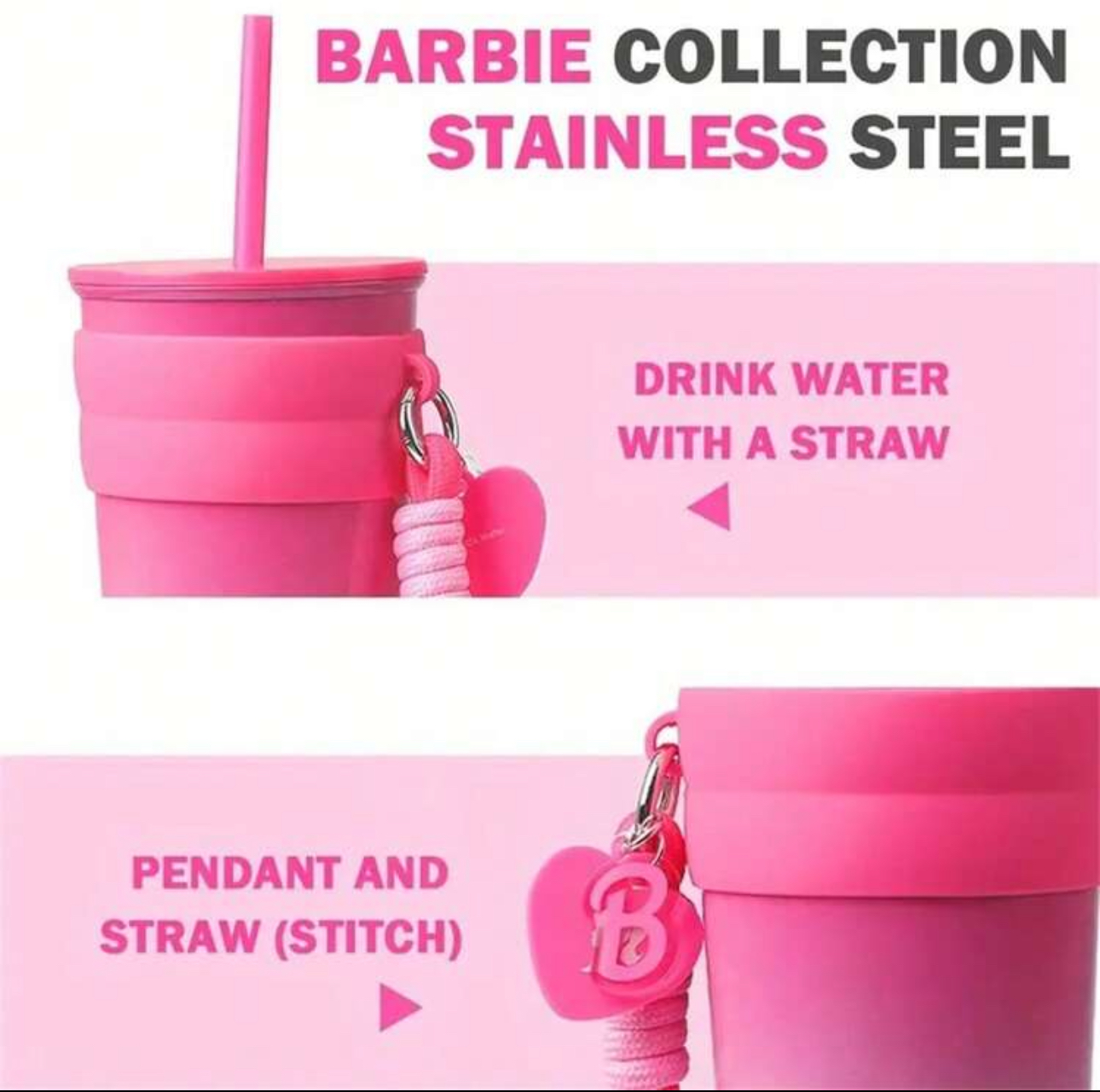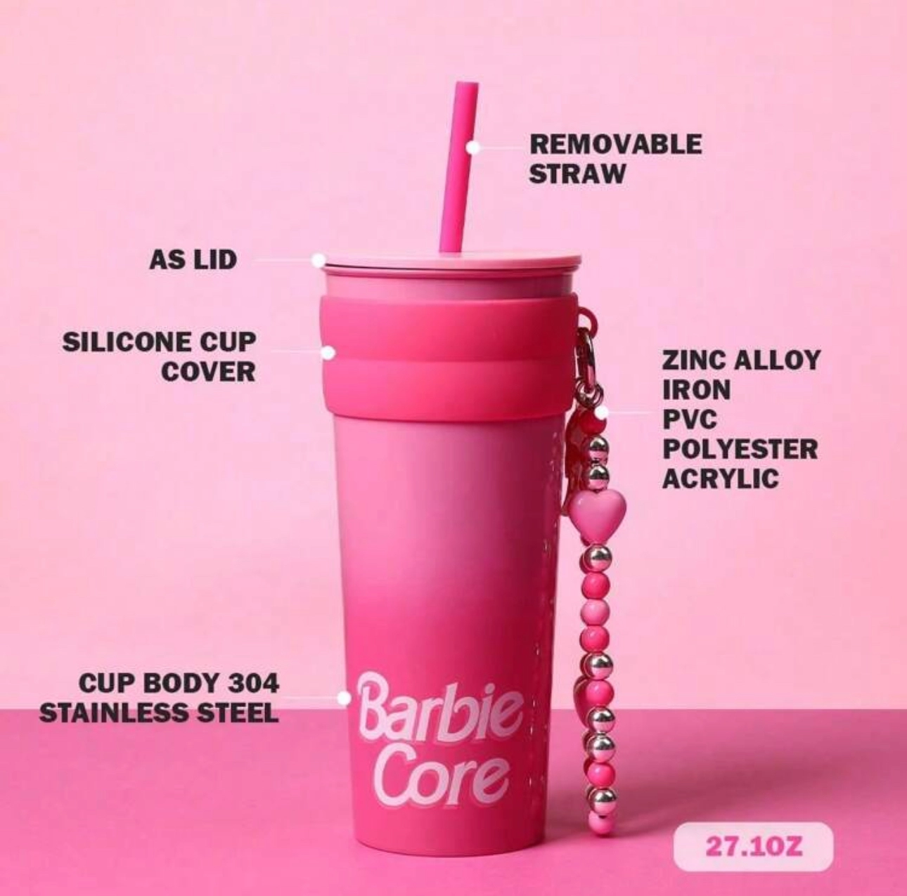 لیوان استیل باربی با نی و آویز فانتزی – ظرفیت ۸۰۰ میلیلیتر | مناسب برای هدیه، نوشیدنیهای سرد و روزمره