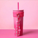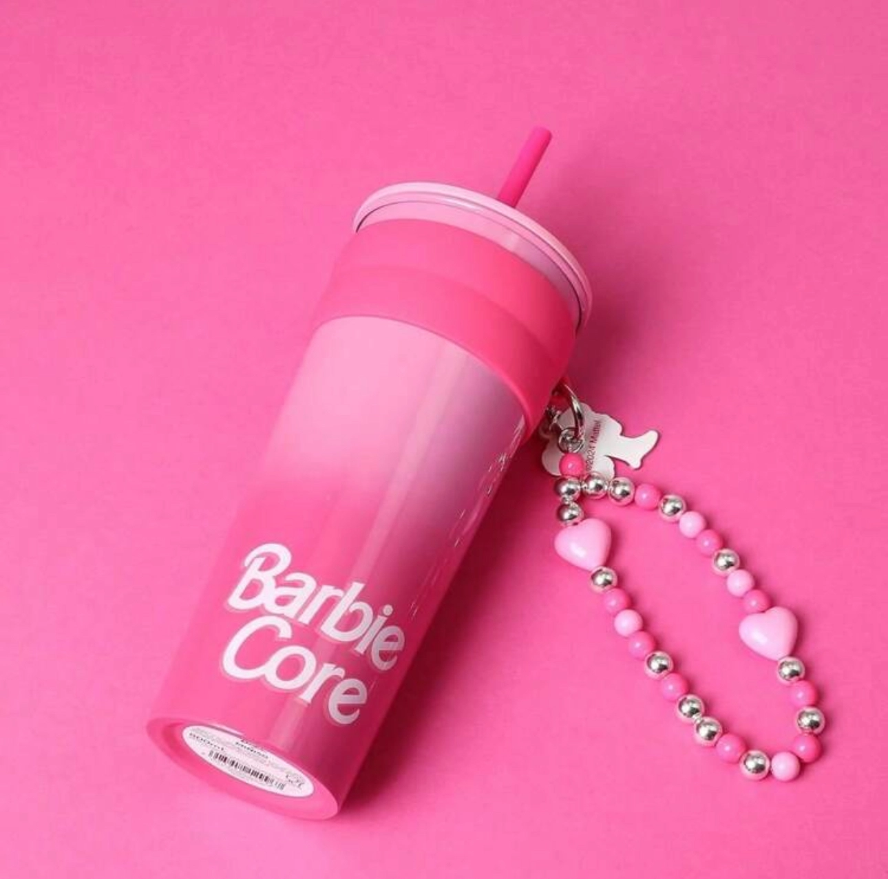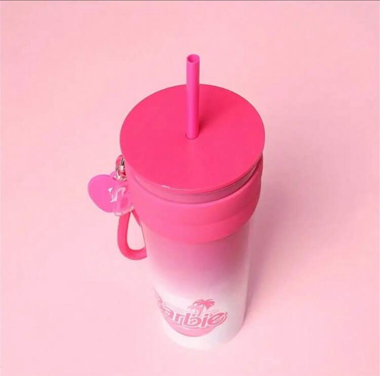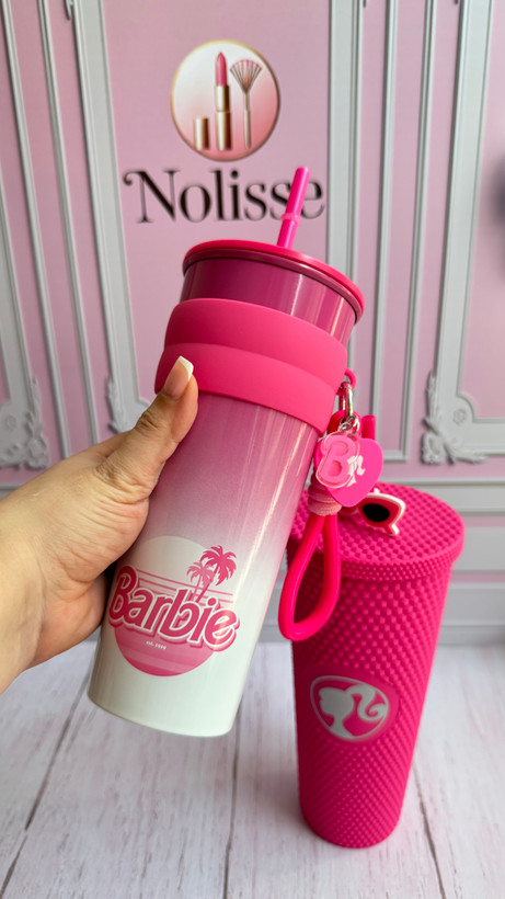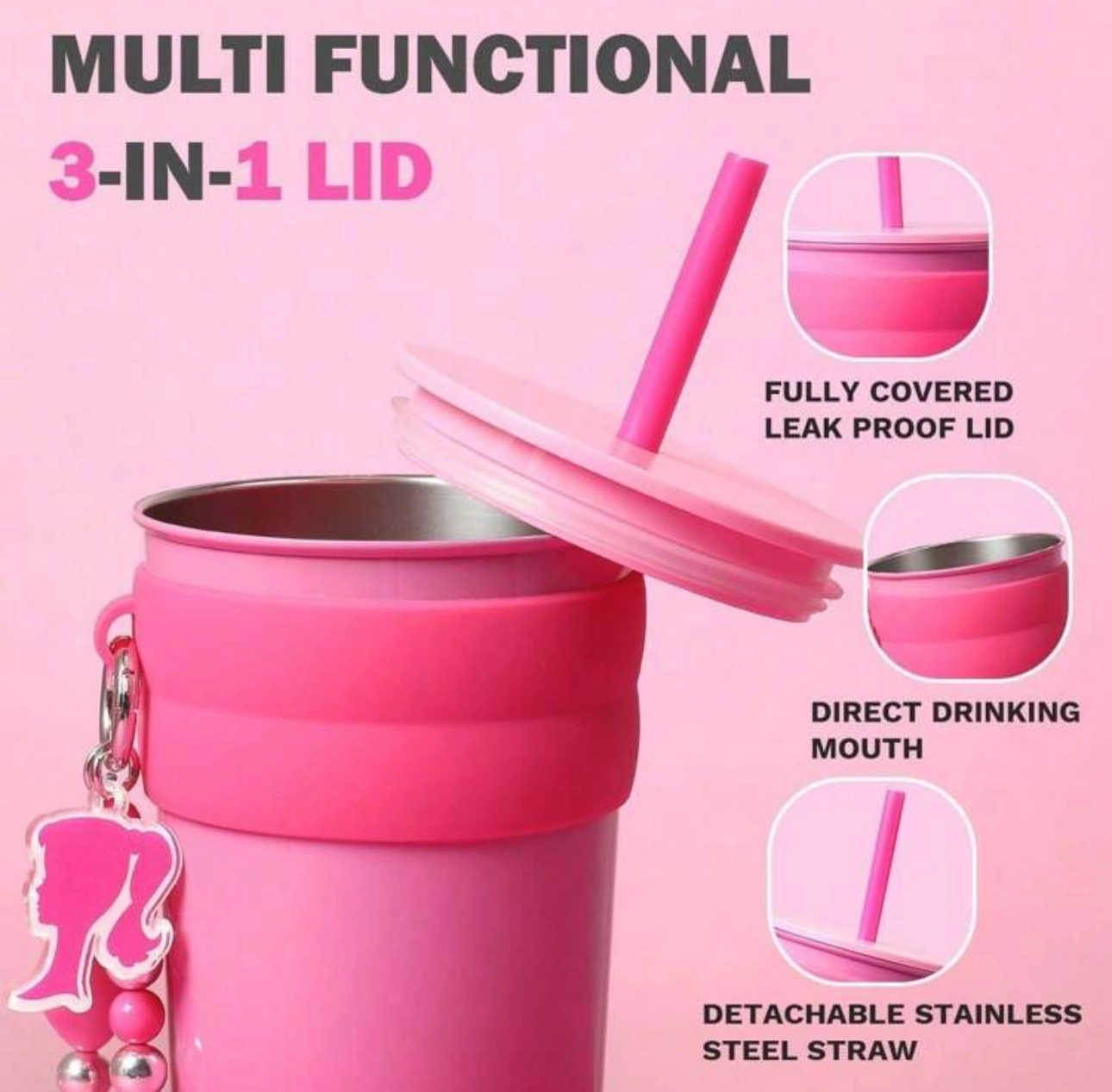 لیوان استیل باربی با نی و آویز فانتزی – ظرفیت ۸۰۰ میلیلیتر | مناسب برای هدیه، نوشیدنیهای سرد و روزمره
