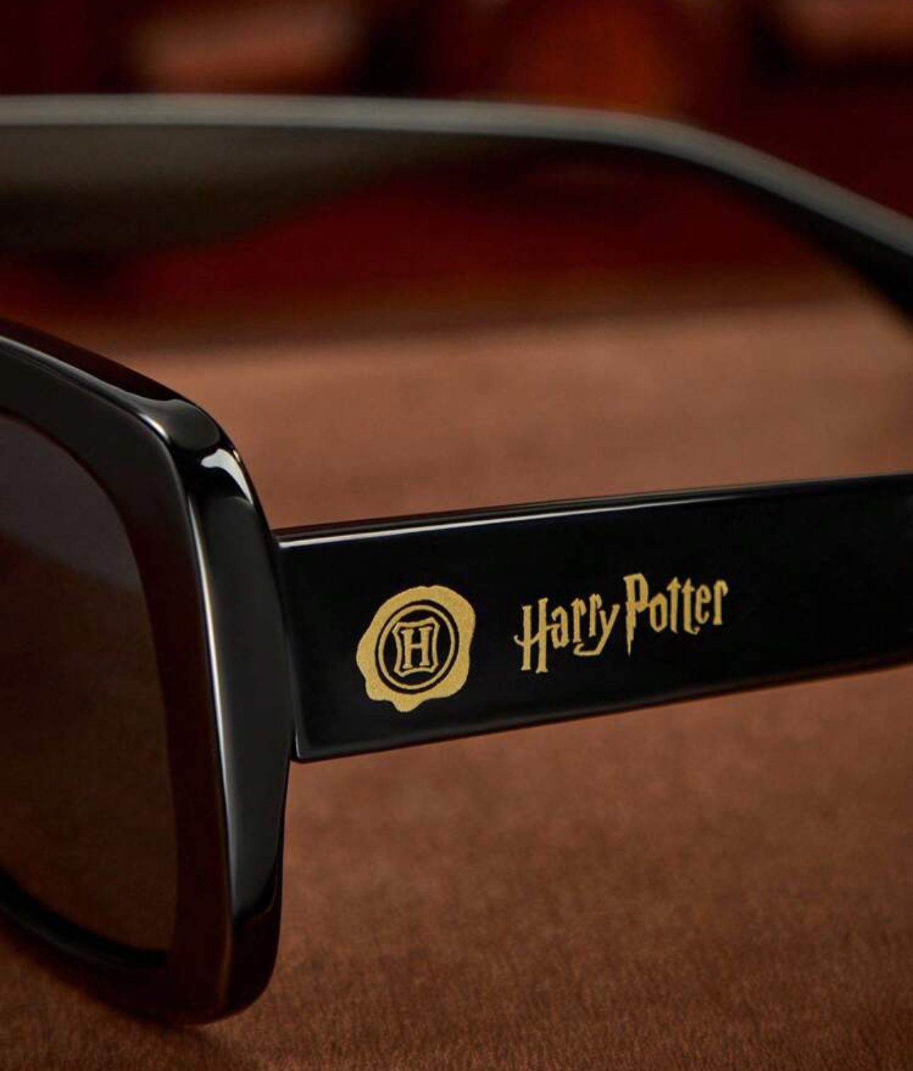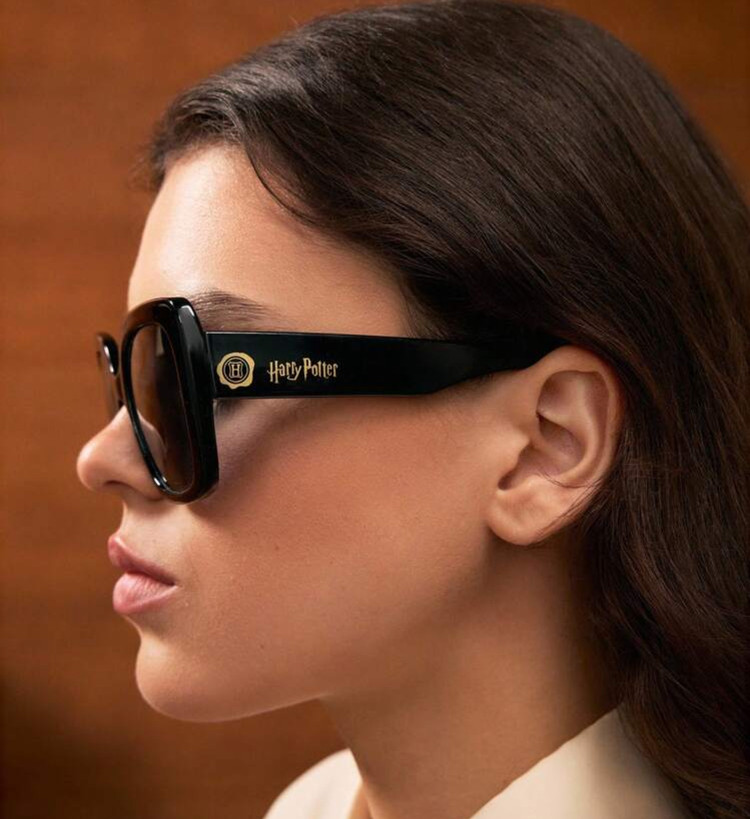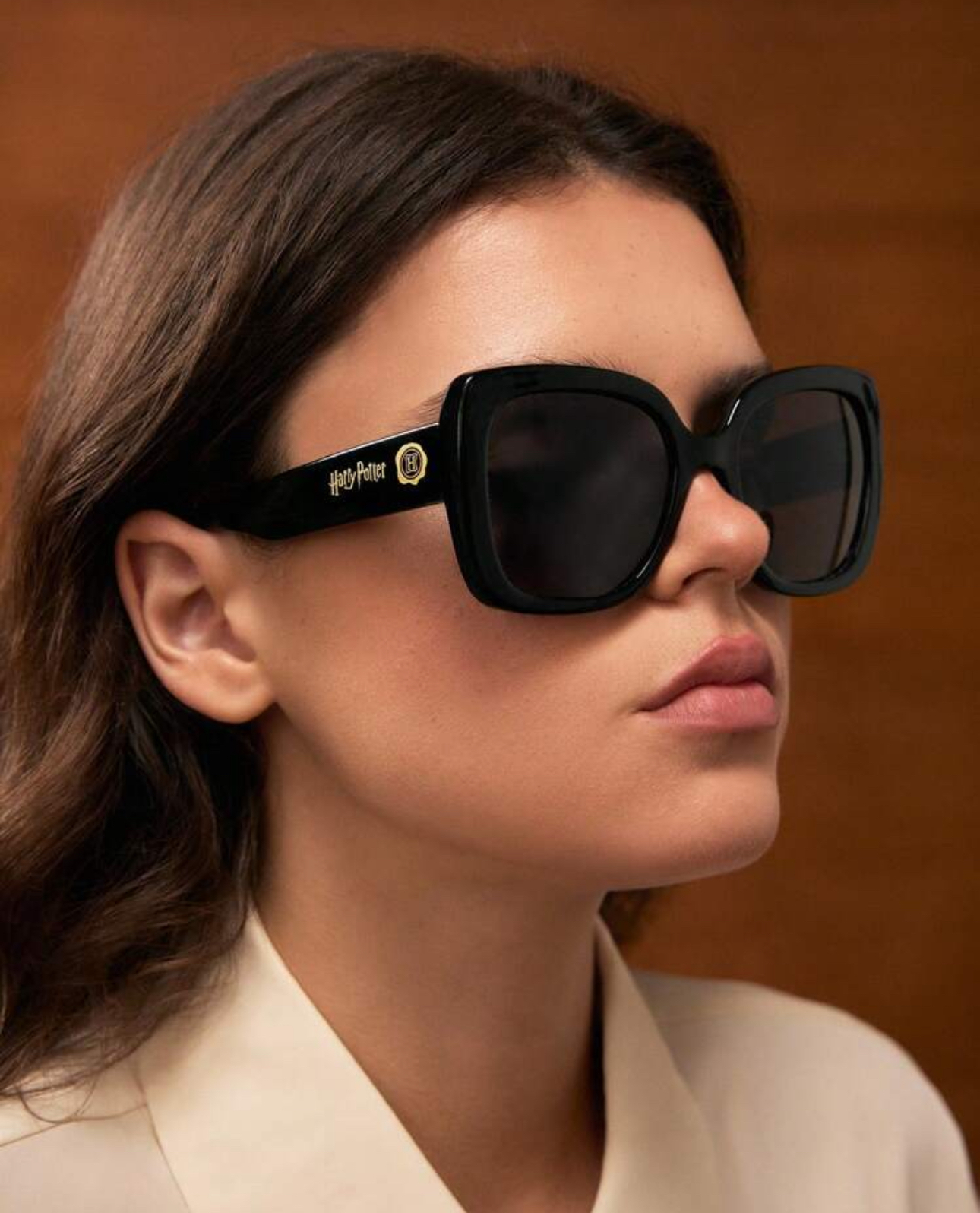 عینک مشکی فشن با قاب مربعی بزرگ و جزئیات طلایی – به همراه کیف چرمی طرح “هدویک”