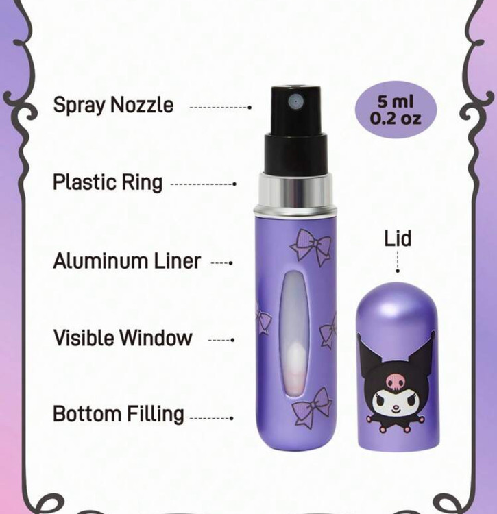 بطری اسپری کوچک ۵ میلیلیتری با طرح کارتونی بامزه | HELLO KITTY AND FRIENDS | SHEIN 🎀 برند: SHEIN 🐱 کالکشن: Hello Kitty and Friends 🧴 ظرفیت: ۵ میلیلیتر (۰.۲ اونس) 🎨 طراحی: چاپ کارتونی فانتزی روی بدنه بدنه کوچک و جمعوجور برای حمل آسان ✨ ویژگیها: قابلیت پر شدن از پایین (Bottom Fillable) مناسب برای نگهداری عطر، آبرسان پوست، تونر و سایر مایعات اسپری با پاشش یکنواخت و نرم ساخته شده از مواد با کیفیت و ایمن مناسب برای کیف، جیب یا سفر
