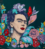 - طرح: چاپ هنری چهره Frida Kahlo همراه با گلهای رنگارنگ