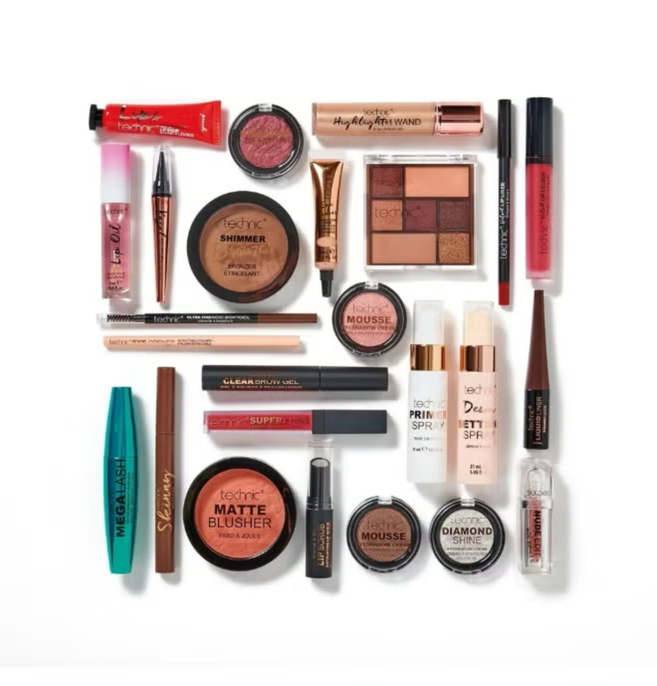 - 🔹 محتویات: شامل مجموعهای از محصولات آرایشی و زیبایی Technic (مانند رژ لب، لاک ناخن، پالت سایه چشم، براش، هایلایتر و لوازم جانبی متنوع)