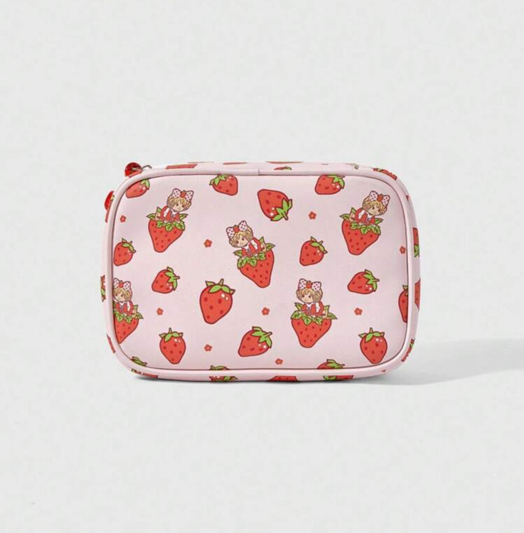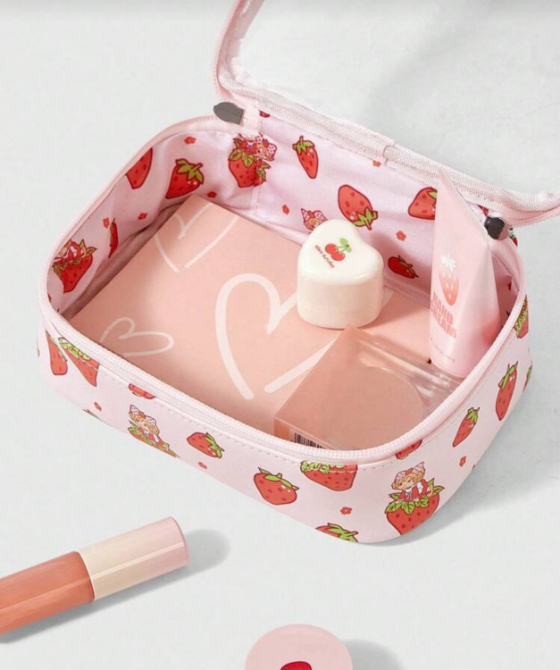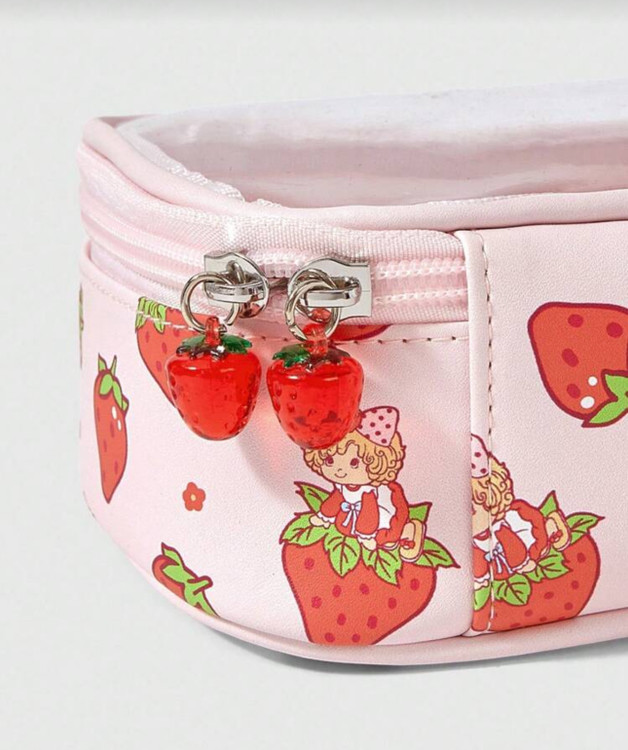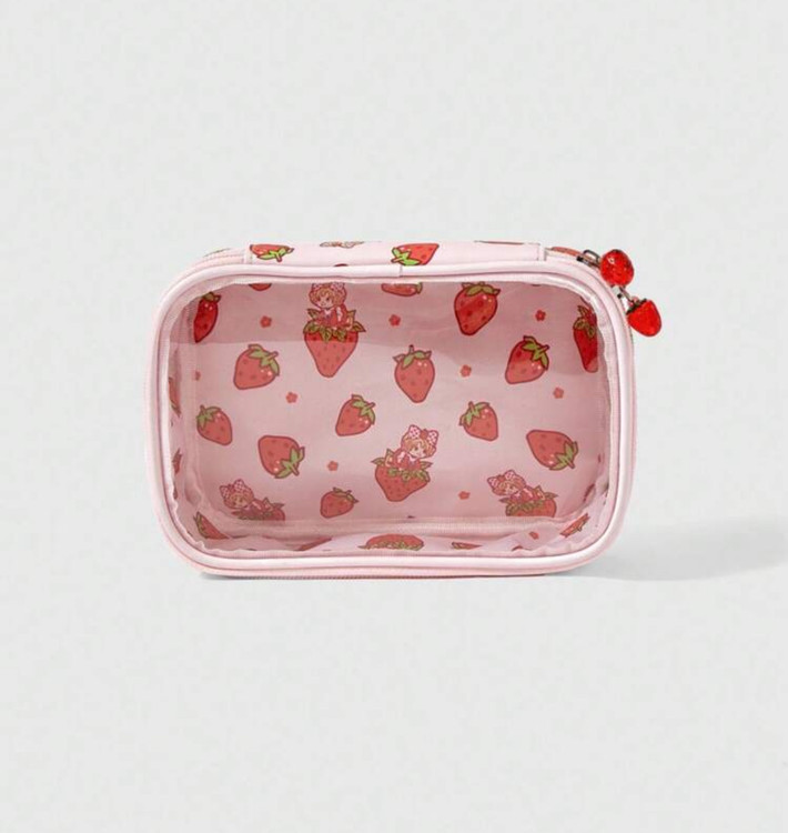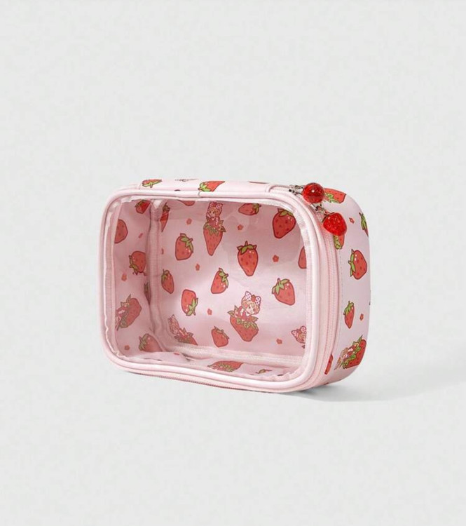 ROMWE Kawaii Women's Pink Cute Strawberry Floral Print Transparent Patchwork Portable Toiletry Pouch