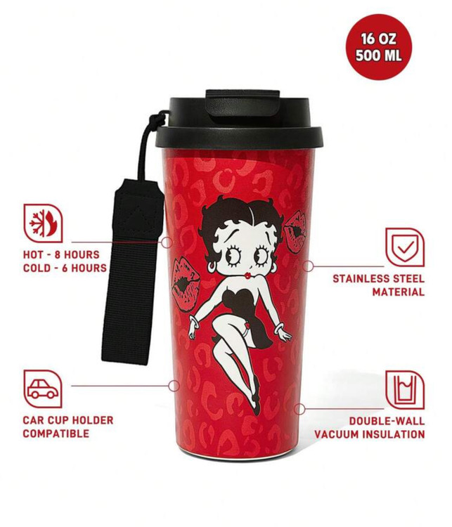 ویژگی متمایز: طراحی زیبا با چاپ شخصیت کارتونی Betty Boop و کیفیت بالای عایق حرارتی، ترکیبی از جذابیت ظاهری و کارایی حرفهای برای نوشیدنیهای روزانه شما