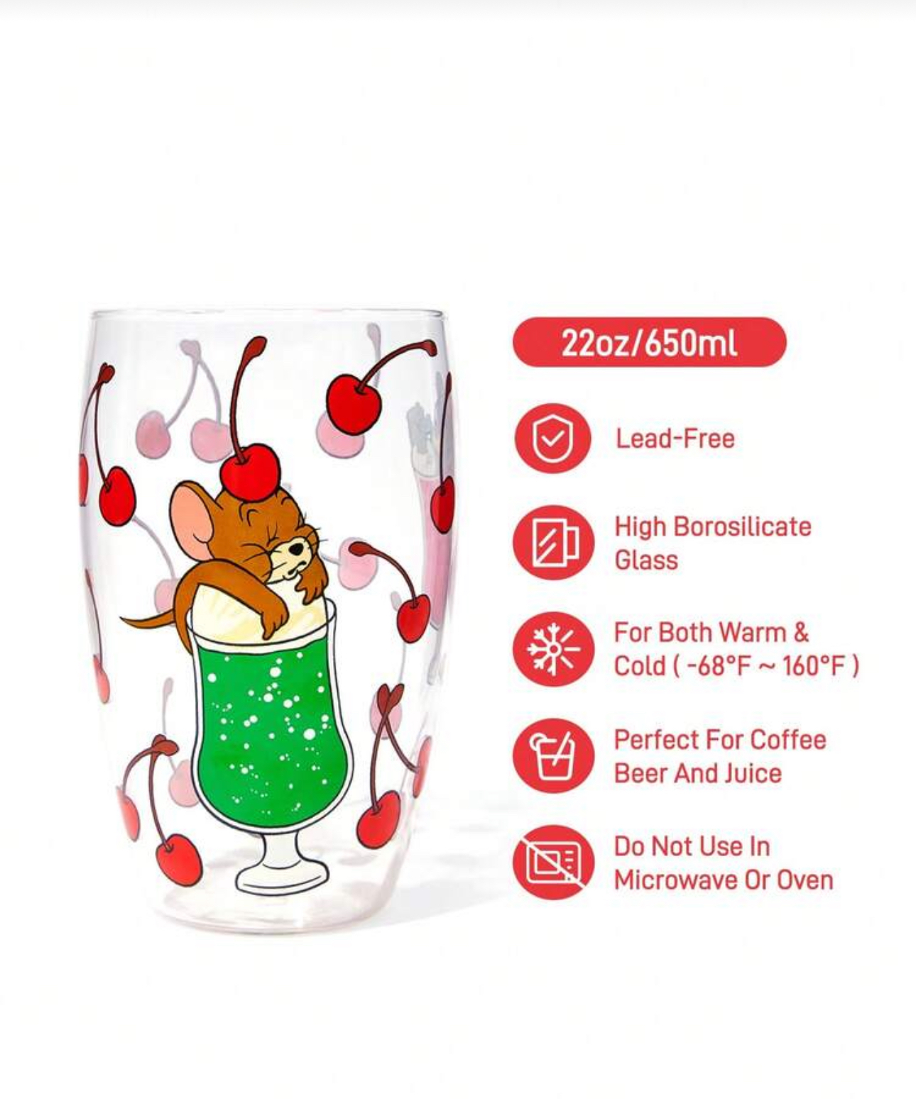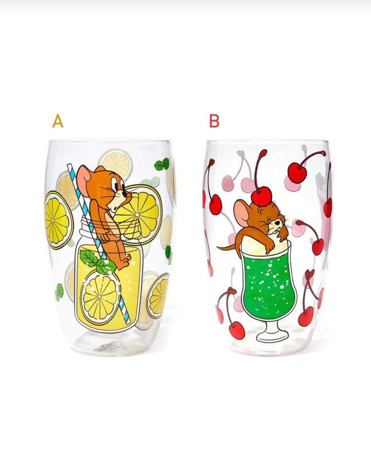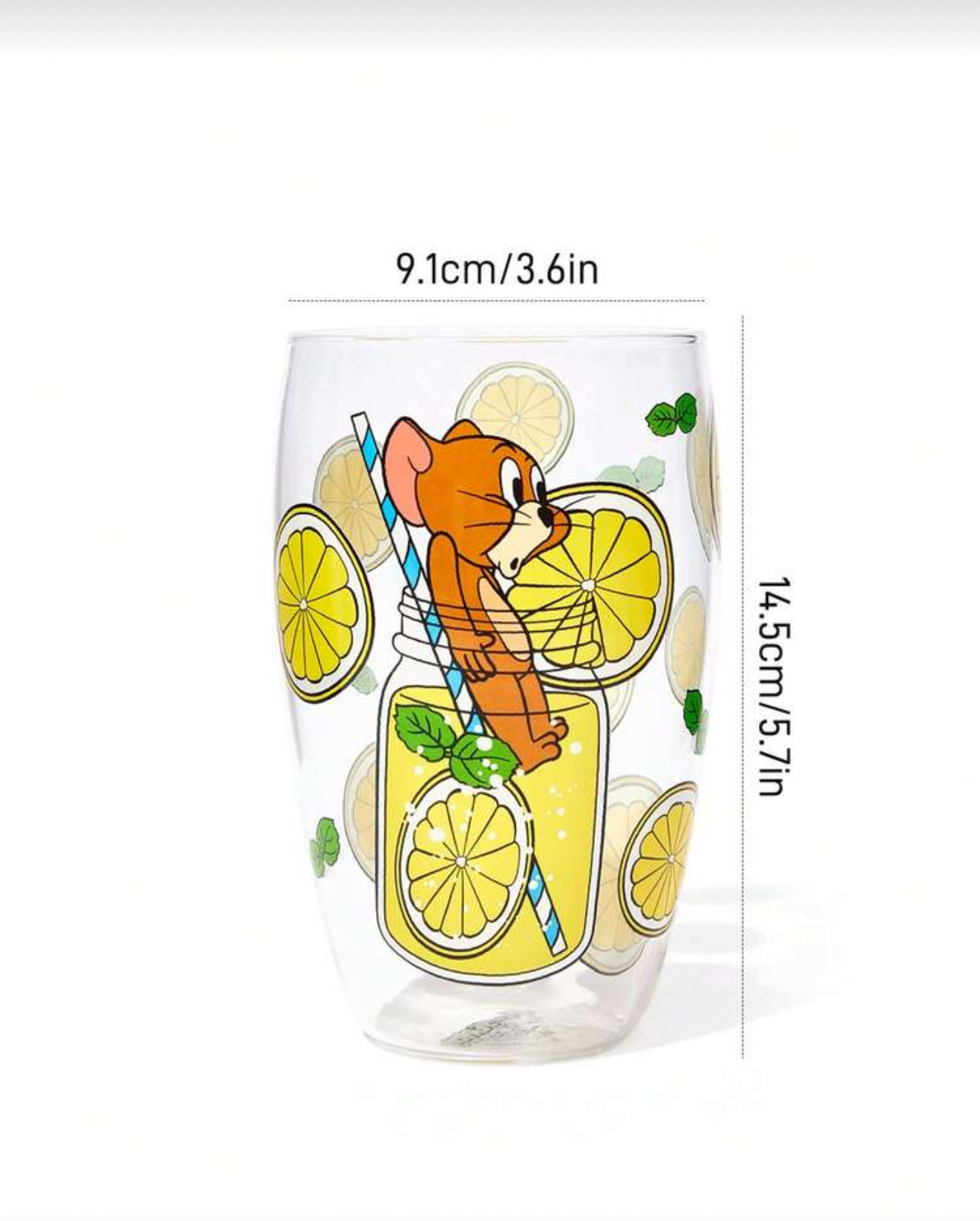- مدل: ماگ شیشهای طرح کارتونی با چاپ رنگی شخصیت جری، لیمو و گیلاس