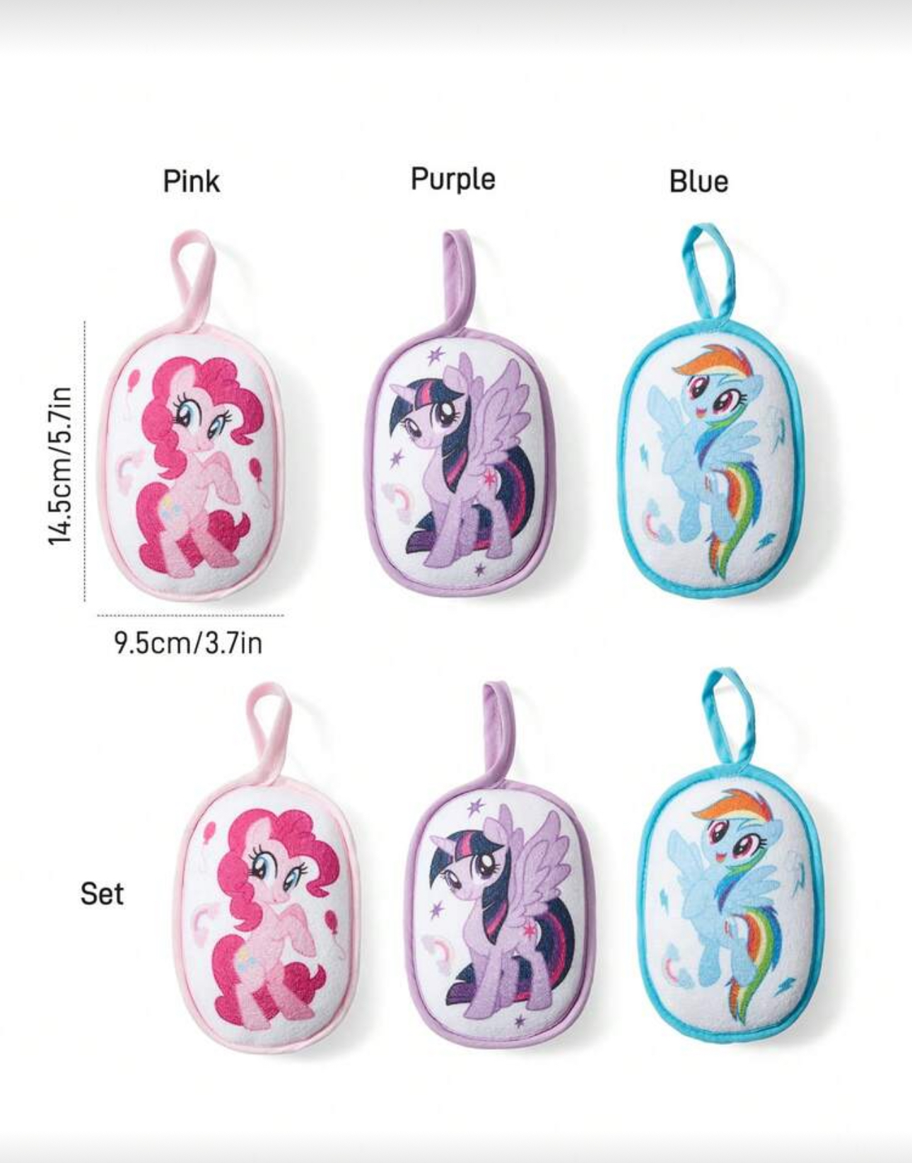 - طراحی کارتونی با چاپ شخصیتهای محبوب My Little Pony (Twilight Sparkle, Rainbow Dash, Pinkie Pie)