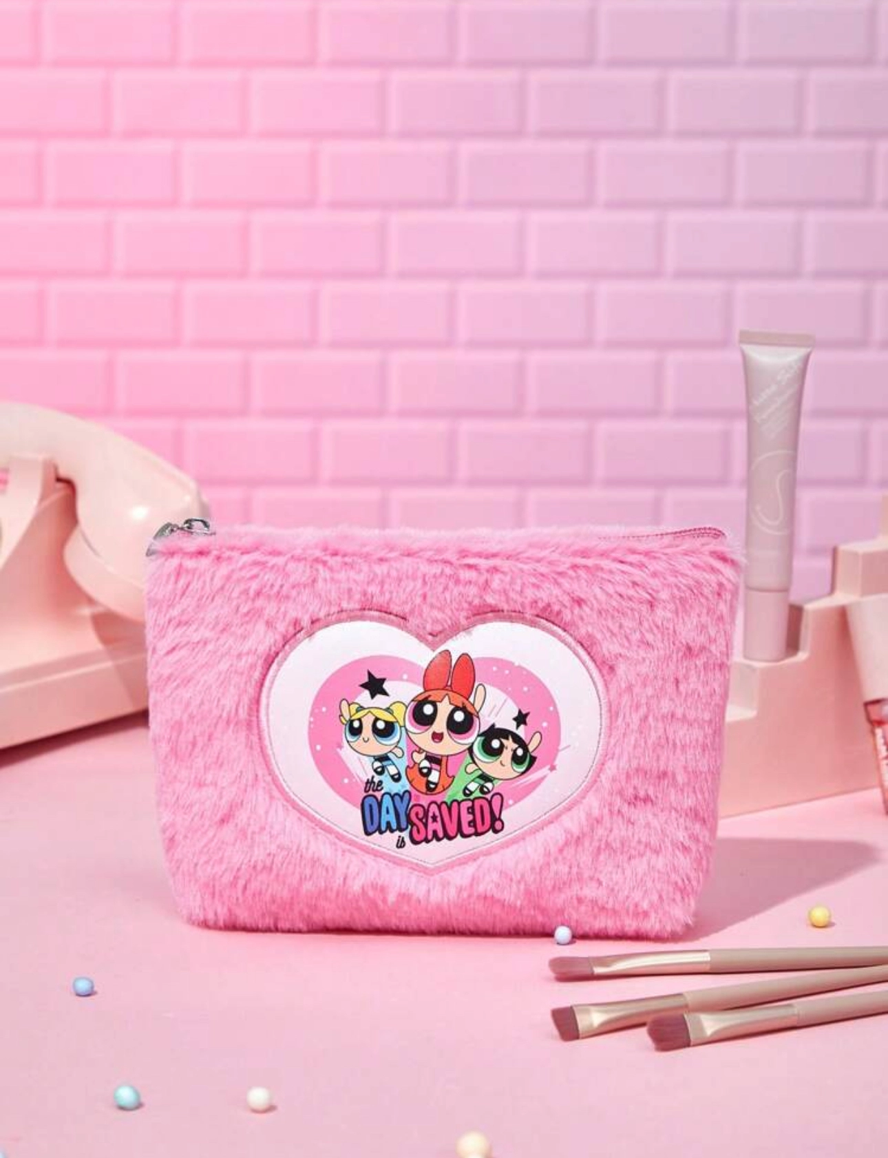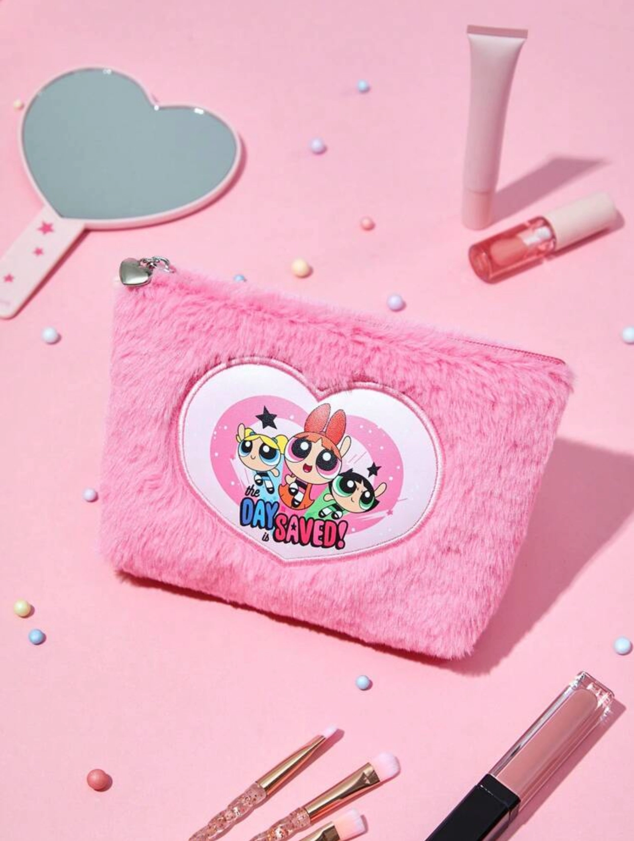 کیف آرایشی پولیشی صورتی طرح Powerpuff Girls X SHEIN ✨ با الگوی قلب ❤️ و گلدوزی کارتونی 💕، مناسب برای نگهداری لوازم دیجیتال، سفر و استفاده روزمره!