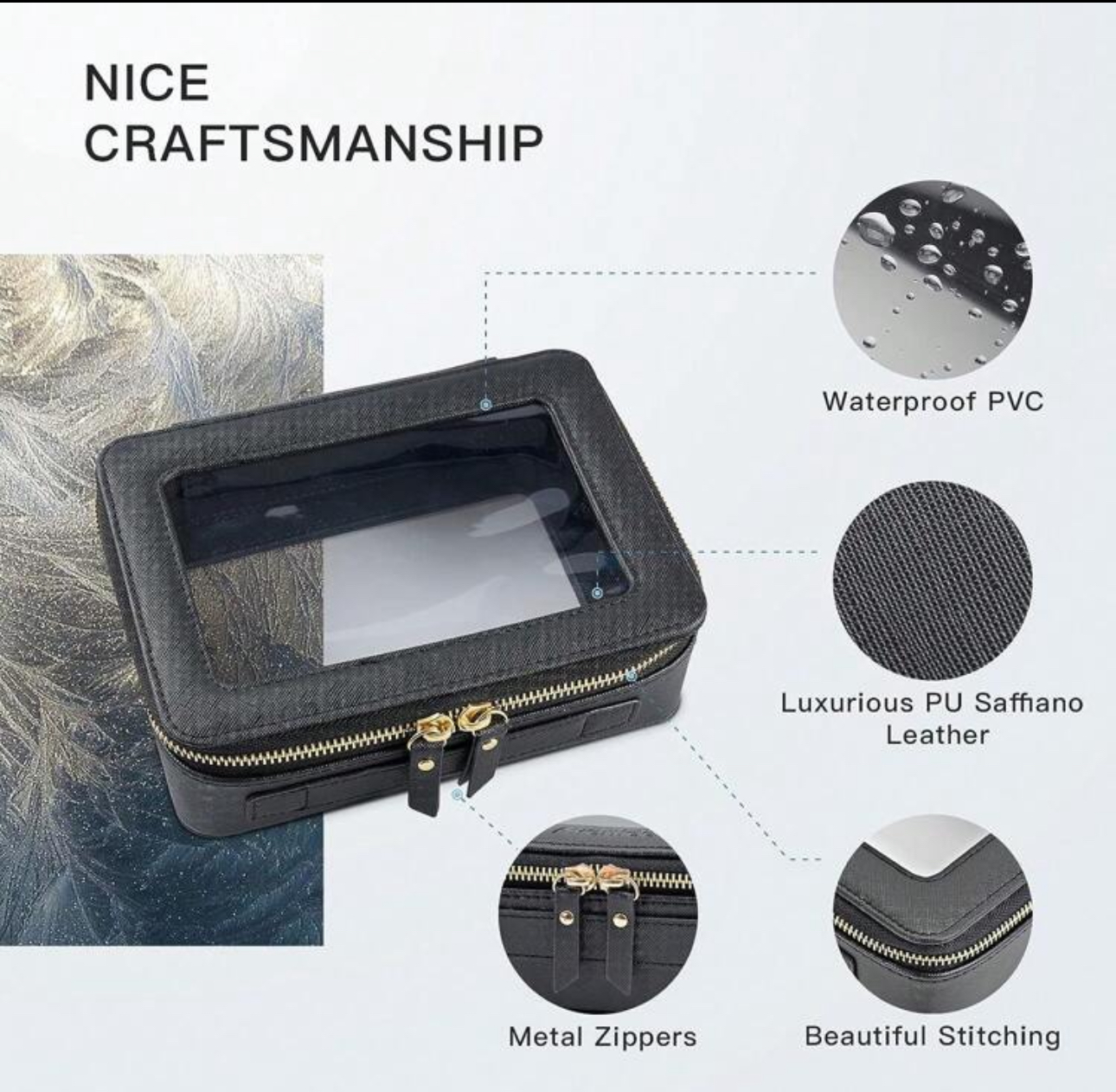 این کیف آرایشی شفاف و شیک با طراحی زیبا و دستهدار، گزینهای عالی برای نگهداری لوازم آرایشی و بهداشتی شما در سفر یا منزل است. با زیپ مقاوم و فضای کافی برای لوازم مختلف، این کیف علاوه بر آرایش، برای استفاده روزانه و بهعنوان کیت بهداشتی نیز بسیار مناسب است.