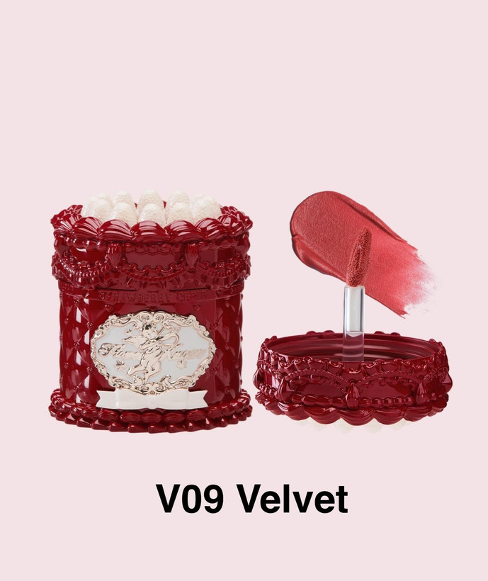 محصول Flower Knows Strawberry Cupid Cake Lip Cream با طراحی مینیاتوری به شکل شیشه مربا و با حجم ۳.۵ میلیلیتر، یک رژلب مایع با پایان مخملی مات است.