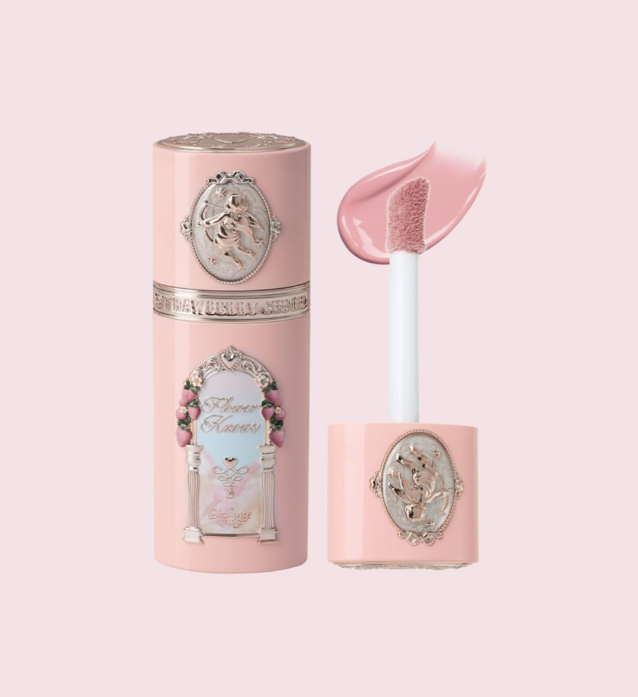 رژگونه مایع Flower Knows از سری Strawberry Cupid با بافتی سبک و ترکیبپذیری بالا، جلوهای طبیعی و درخشان روی گونهها ایجاد میکند.