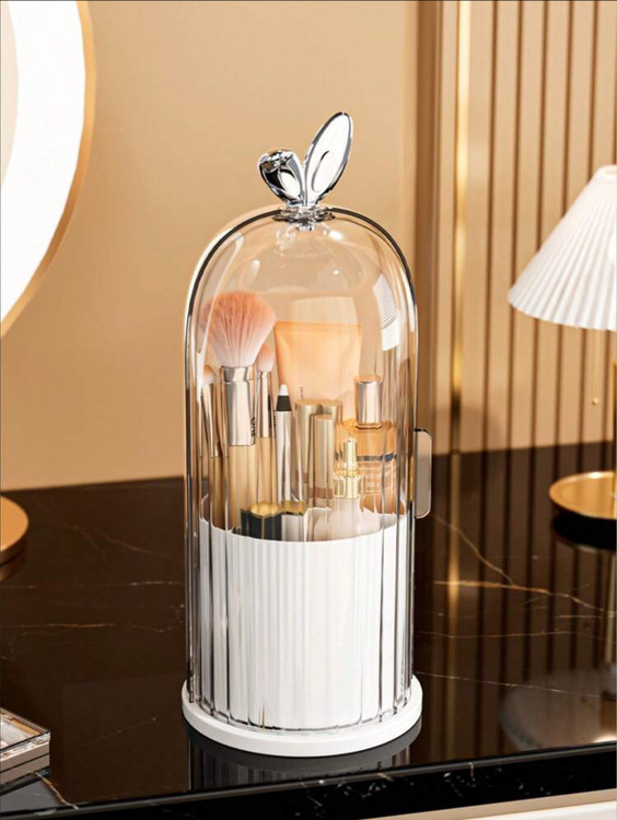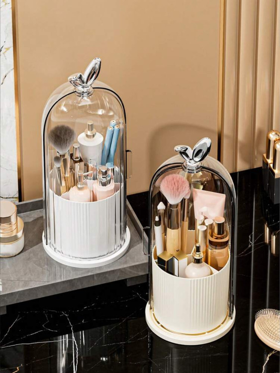 جعبه نگهداری لوازم آرایشی و بهداشتی چرخشی ۳۶۰ درجه با درپوش شفاف – مناسب برای نگهداری برسهای آرایشی، مسواک و لوازم آرایشی، سینی ضد گرد و غبار برای حمام، دارای محفظههای متعدد